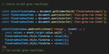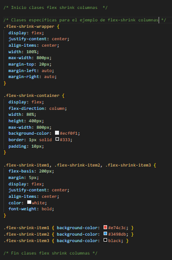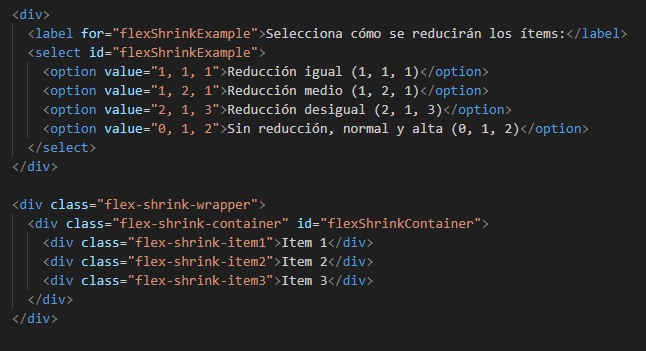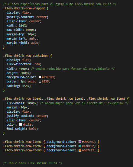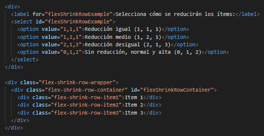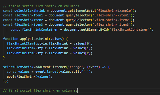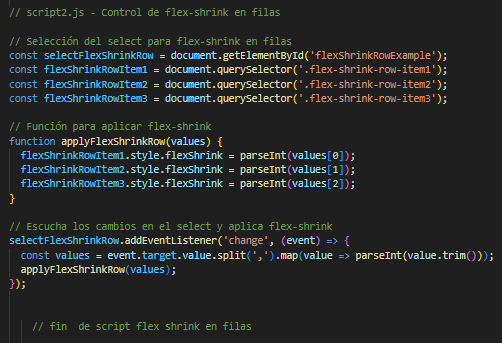 El siguiente es el codigo del ejemplo en HTML, CSS y JavaScript, para flex shrink en filas
