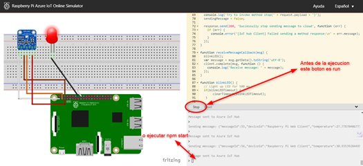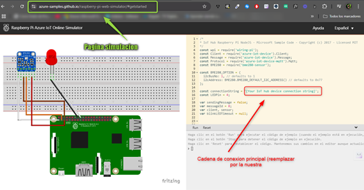 En la página SIMULADOR RaspberryPI en donde apreciamos él simulador en él código de la derecha, en la línea 15 copiaremos este código y lo utilizaremos allí en esa línea 15