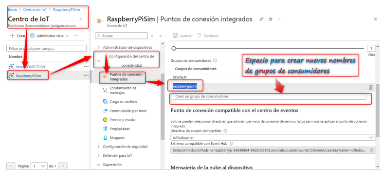 El siguiente paso será configurar y crear el grupo de consumidores. Para ello, debemos ir al IoT Hub dentro de Azure y acceder a nuestro dispositivo, en este caso RaspberryPiSim. Luego, dirígete a la configuración del centro de conectividad y, en el espacio destinado a los grupos de consumidores, dale un nombre a nuestro grupo; para este caso lo llamaremos de forma similar al entorno, es decir, 'raspberrypisim' (con letras minúsculas). Es importante recordar este nombre ya que más tarde lo utilizaremos en la configuración del socket para establecer la comunicación entre el dispositivo y la aplicación. Esta configuración será esencial para poder leer y procesar los datos que lleguen desde el dispositivo a través del Azure IoT Hub. Además, definir correctamente el grupo de consumidores nos permitirá administrar las suscripciones y asegurar que cada aplicación conectada reciba la información que necesita sin conflictos. Esto es especialmente útil cuando múltiples aplicaciones desean consumir los datos al mismo tiempo, asegurando una comunicación eficiente y controlada.