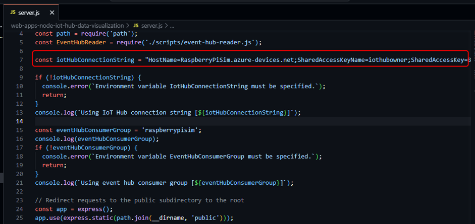 Igual que en él código de la simulación debemos reemplazar en la constante de este código la línea const iotHubConnectionString, por la cadena de conexión principal que usamos en él simulador del Raspberry Pi