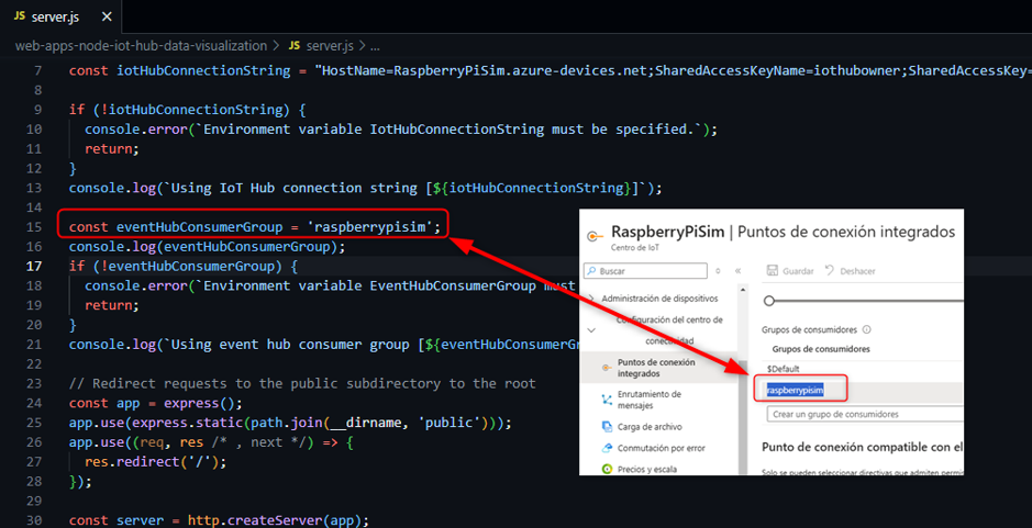 Además, también la línea que se refiere al grupo de consumo configurado previamente que nosotros llamamos raspberrypisim, en la línea 15 del server.js