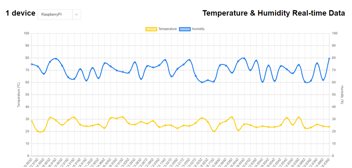 Esto permitirá que se escuche él puerto 3000, y se dibuje las señales actuales, que empieza a recibir este socket, del sensor de temperatura y humedad del Raspberry Pi Simulado